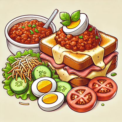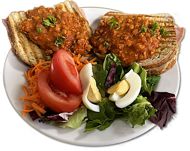 Gegrilde boterham met ham en kaas en bolognesesaus erover. Wordt geserveerd met koude groentjes erbij (sla, tomaat, wortel, komkommer en ei).