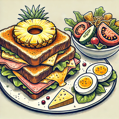 Croque Monsieur met een lekker schijfje ananas erbij! Wordt geserveerd met koude groentjes (sla, tomaat, wortel, komkommer en ei).