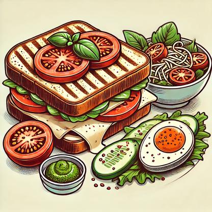 Gegrilde boterham met tomaat, mozarella en pesto. Wordt geserveerd met koude groentjes (sla, tomaat, wortel, komkommer en ei).