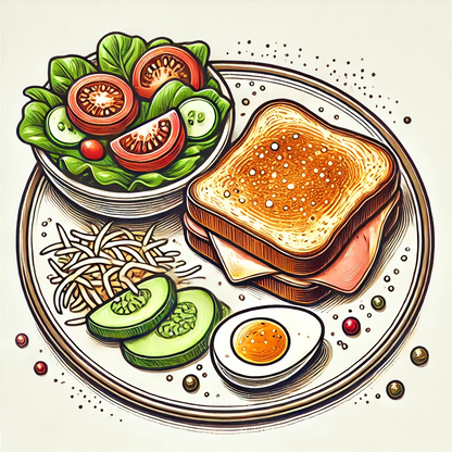 Gegrilde boterham met ham en kaas en een eitje erover. Wordt geserveerd met koude groentjes (sla, tomaat, wortel, komkommer en ei.
